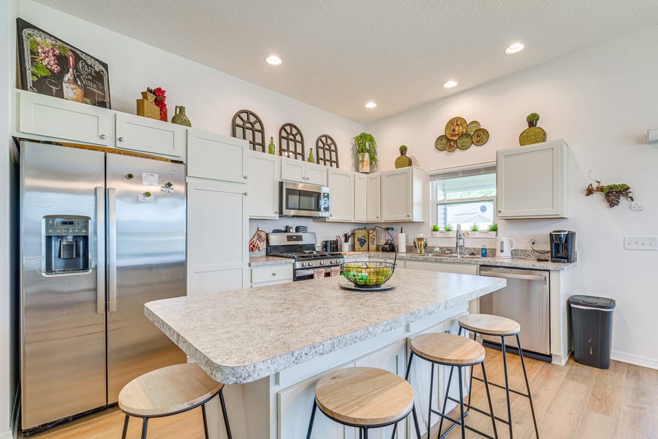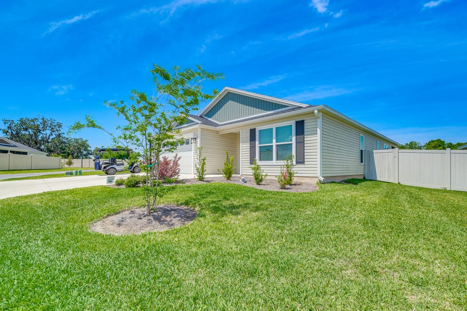Located in The Villages Richmond, this Wildwood, FL, vacation rental is the perfect place for your next getaway! Welcoming you into the 3-bed, 2-bath home is an open living area with beautiful decor, a Smart TV, and a kitchen with stainless steel appliances. Outside awaits the lanai with another Smart TV and a gas grill, while Brownwood Paddock Square is 2 miles away. After a shopping spree, hop onto the golf cart and head for the community perks, like multiple pools and executive golf courses.