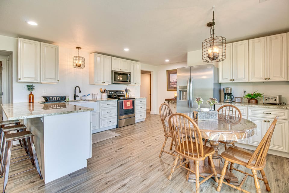 KITCHEN: Stove/oven, refrigerator, microwave, dishwasher, Crockpot, dishware/flatware, cooking basics, drip coffee maker (starter coffee provided), toaster, breakfast bar