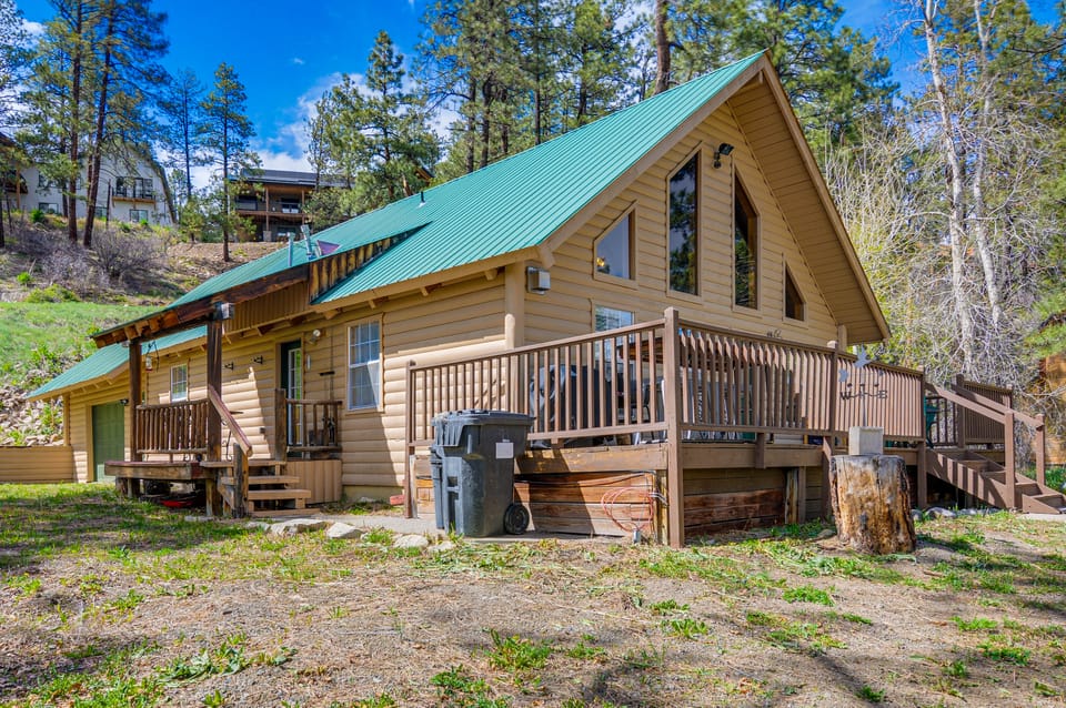 Book your next Colorful Colorado retreat at this 3-bed, 2.5-bath Pagosa Springs vacation rental! This A-frame cabin offers a grand living area with a flat-screen TV and fireplace, a full kitchen, a private outdoor space, and access to the area’s outdoor spots. Cast a line in the neighborhood pond or the San Juan River, hike the Jackson Mountain Trail, ski at Wolf Creek, or tee off at Pagosa Springs Golf Club! Back home, sip cocktails on the furnished deck, then gather inside for a game night.