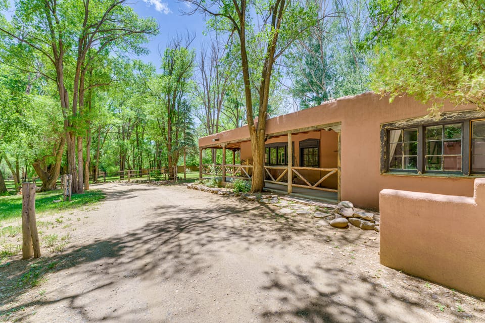 Welcome to 'Millicent Rogers Cottage' at Turtle Walk Ranch, a 2-bed, 2-bath Taos vacation rental perfect for extended stays! Newly renovated by a prestigious designer, this historic home offers a custom-built kitchen, original mid-century modern furniture, eclectic decor, local pottery, and a wraparound patio with a BBQ grill. Relax by the fireplace before heading out to Taos Plaza or Taos Ski Valley. When evening comes, climb into the hot tub to unwind or gather around the fire pit.