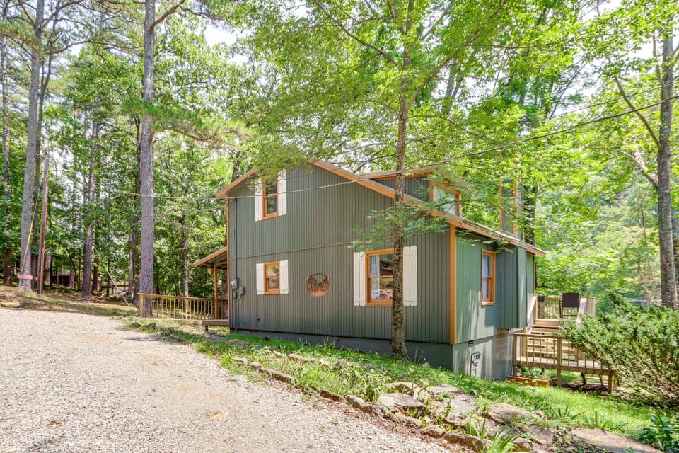 Immerse yourself in the natural beauty of Eureka Springs at this lakefront vacation rental! Upon arrival at the 3-bed, 2-bath cabin, you'll be greeted by lofty trees and abundant wildlife — and if you're lucky, you might even meet the 3 geese who call this property home. After settling in, head down to the shared dock, enjoy a charcoal-fired feast on the private deck, or visit the llamas at Lake Lucerne Resort and Ranch. It's up to you!