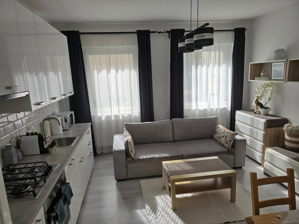 Czysto, dobre wyposażenie, dostępny poczęstunek - woda, kawa, przekąski. Łatwy kontakt z osobą wynajmującą. Wygodny salon z aneksem kuchennym. Dobra lokalizacja. Dostępny darmowy parking 100 m od apartamentu.