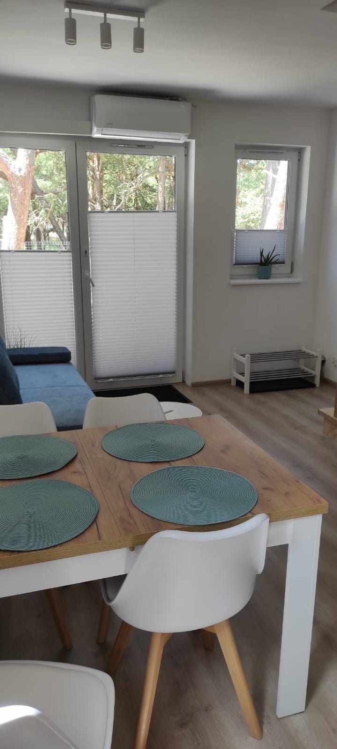Spędziłem z moją rodziną tydzień w jednym z tych apartamentów. Z tego co mi wiadomo apartamenty są dopiero od zeszłego sierpnia co za tym idzie są one nowe. Spędziliśmy tam bardzo piękny i udany wypoczynek. Pierwszy fakt że akurat między 9 a 16 sierpnia było piękne okienko pogodowe w Rowach a co za tym idzie mega duży plus że apartamenty są położone zaledwie 100 m. A drugi fakt jest taki że w środku mieliśmy wszystko czego potrzebowaliśmy. Bardzo dobrze wyposażona kuchnia wraz z otwieraczem do wina, generalnie w wielu innych lokalizacjach czesto brakuje. Kubki szklanki czy też kieliekszi do wina jak i również wódeczki. Dosłownie wszystko. Można nawet znaleźć toster codzienne tościki na ciepło z masłem czosnkowym bomba. I to co większość lubi poranna kawa na tarasie. Tarasy są jeden obok drugiego nie są w żaden sposób odseparowne ale to raczej nie jest jakimś wielkim problemem jak się ma fajnych sąsiadów, a my właśnie mieliśmy. Jest parking na posesji która jest zamykana kod do bramy podaje właściciel. Także nawet dzieci same nie wybiegna. Jedyne co mogę. Napisać że ludzie którzy mają zamiar tam korzystać dużo z internetu muszą się nastawić na gorszy sygnał. Jest wifi w domku ale bardzo słabe żarówno w fonie jak i programy telewizyjne,ktore często przerywają. Dla nas to nie był problem. Bo byliśmy dla siebie i nie potrzebowaliśmy go ale inni mogą się zdziwić. I żeby była jasność że to nie jest problem złego internetu choć może nie wiem. Ale obstawiam raczej to iż apartamenty znajdują się między innymi większymi apartamentowcami. I raczej to one blokują dojście sygnału do domu. Nawet sygnału telefonicznego, ponieważ 100 m dalej na plaży czy już jak się idzie na centrum telefon również wraca do norm użytkowania. Na duży plus jeszcze zasługują mega wygodne materace w sypialniach. W gorące dni natomiast jest klima w salonie. Ale my nawet nie użyliśmy. Z uwagi na bycie całymi dniami po za obiektem a jak już to na tarasie. Wlascicielka przemiła kobieta.