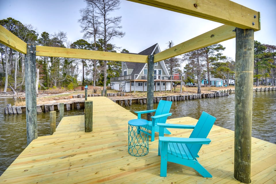 Find peace and serenity on the North Carolina coast at this 2-bed, 2-bath cabin with a loft. This riverfront Shiloh, NC, vacation rental sits on a shallow, sandy bank of Albemarle Sound with beautiful water views inside and out. Whether you’re taking the kayaks out for a relaxing ride, dining al fresco on the wraparound deck, or stargazing by the fire pit, you’re sure to find your bliss at this remote retreat. The bright and modern interior is the perfect place to unwind after your adventures.