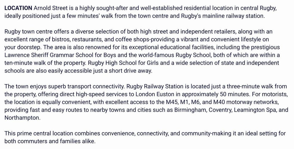 Excellent location. The house was immaculate and stylish. The host was very responsive. Lovely touches like toiletries and tea/coffee. Quiet street even though a Saturday, it felt safe. We got parked fairly close with the permit Richard arranged. The beds were very comfortable. We even looked for dates for our next trip to Rugby but it was already booked! Considering a travelodge was £60 and we would have had to share a bed, getting a whole house and a room each for £100 was a no brainer.