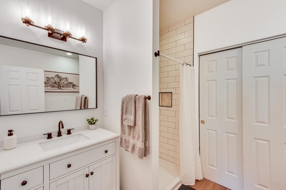 It is two and a half baths, not three. I may have misunderstood the listing. Just be aware, the stairs are steep to the upstairs. Very manageable, but not for someone who has vertigo or trouble with stairs. (One bedroom downstairs which our older parents used.) The TV is a smart TV, and we could not get any local TV or ESPN. Not a big deal, just something we didn’t expect.