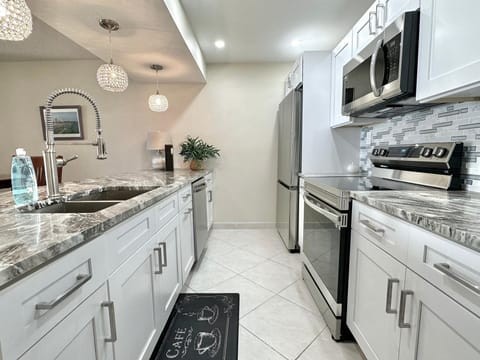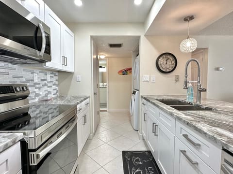 The condo is turnkey, with all furniture and furnishings, and features hurricane-impact windows, an inside laundry with a full-size washer and dryer, and access to an array of resort-style amenities, including a heated waterfront pool, gym, sauna, and more.