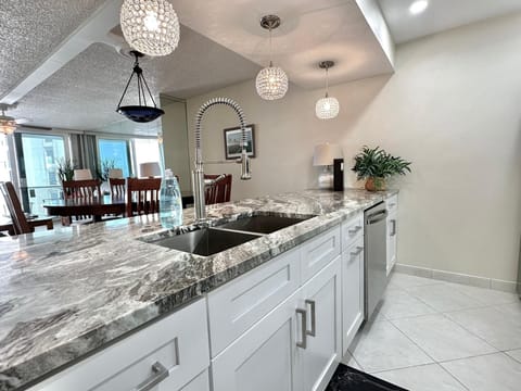 This beautifully maintained and completely renovated 5th-floor corner unit is filled with natural light and offers breathtaking Gulf views from a covered balcony, perfect for watching sunsets, boats, and playful dolphins.