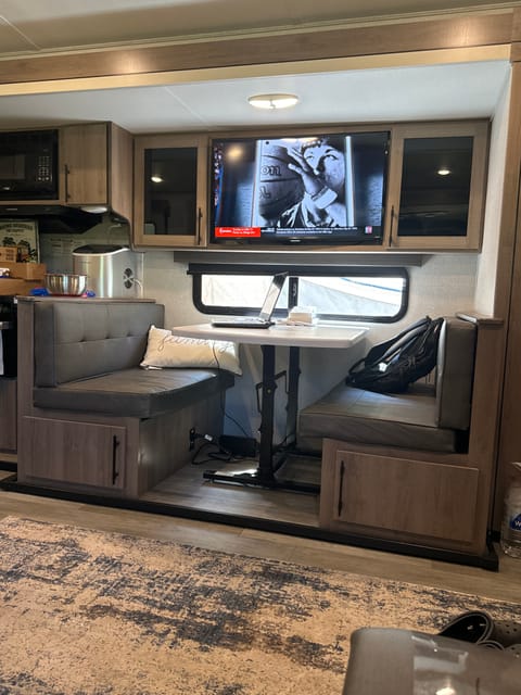 The camper has four reclining theater style chairs and a 40-inch smart tv. There is also a small smart tv in the master bedroom. There are two opposing slides in the kitchen/dining/living room. We have a coffee bar set up in the kitchen with a small amount of coffee and supplies available.