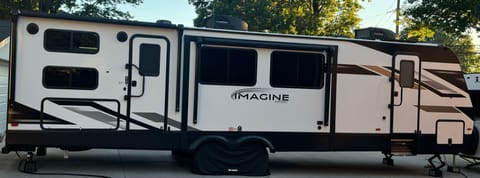 We are looking forward to sharing our love of camping with others. Take your family camping with our Grand Design Imagine 3210BH. This camper sleeps can sleep up to 8 people (two small children for dinette booth). The front of the camper has a residential 10-inch queen size bed. The rear bedroom has four bunks (2 wide bunks, 2 normal size). The 2 lower bunks have upgraded 6-inch mattresses. Each bedroom as a solid wood sliding barn door for privacy. There is a full bathroom on board as well. Pets are welcome; however, an additional damage deposit will be required. No pets are to be left unattended in the camper, unless kenneled.