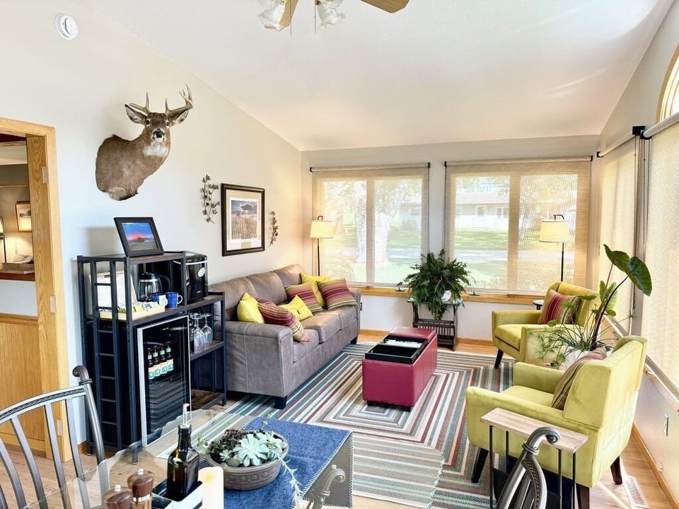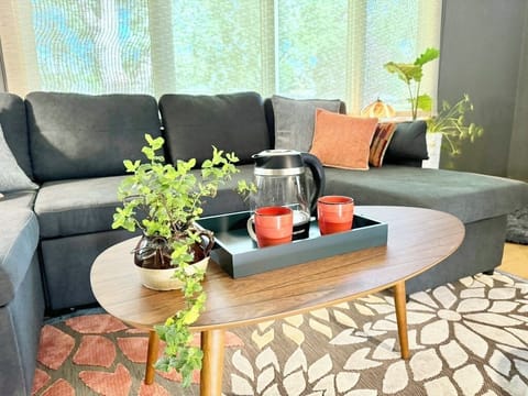 The living room also includes a comfy sofa, a sound system, books, board games, a card table, and a laundry area. Stay connected with free high-speed WiFi.