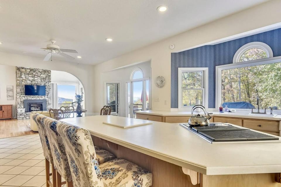 Indulge in a peaceful retreat at Mountain Top Mansion with PANORAMIC VIEWS and plenty of room for all your guests, our elegant House in Asheville. Enjoy amenities including Pets allowed and Non-smoking, and more.