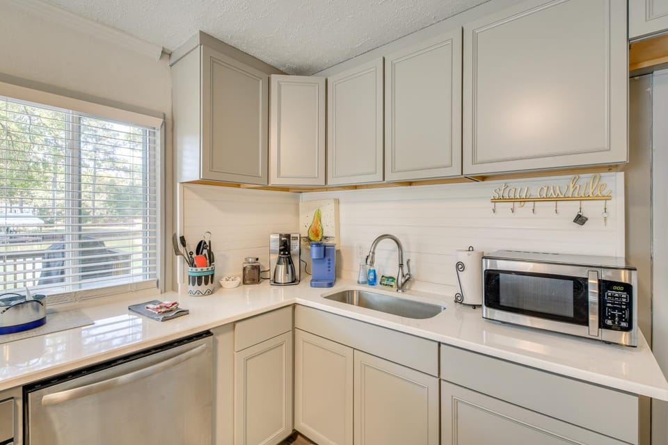 I didn't read the fine print and didn't realize there was a not a stove. They did have an electric skillet and crock pot for use, but there weren't many outlets to choose from, so the cooking inside was very awkward. The rug at the point of entry is not made to be an entryway rug. Please be careful walking inside because it slides. The pictures online make the house look bigger than it is, but it is still a decent size for a party of 4. The house is located right down the lake from Cajun Broilers, so it is close to a main highway. That being said, we did hear sirens all weekend. ( It didn't bother us too much, but I know some people are sensitive to that.)
