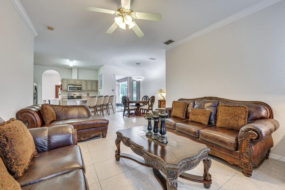 Indulge in a peaceful retreat at Southern Dunes Golf Home: Pool & Covered Patio, our elegant House in Haines City. Enjoy amenities including Parking Available, Dryer and Fan, and more.