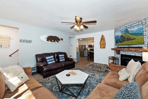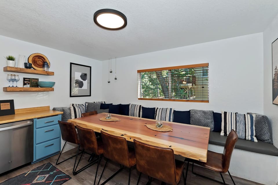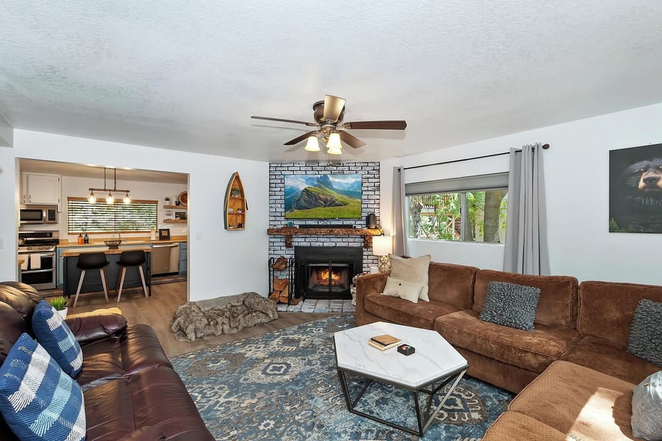Happy Beaver Manor welcomes you to kick back and relax in the inviting and cozy living area where you can enjoy the warmth of the wood burning fireplace and snuggle up on the plush sectional couch or leather sofa to watch your favorite movie after a long day on the mountain. The modern mountain decor and cozy setting creates a wonderful space for you and your group to create lasting memories together.