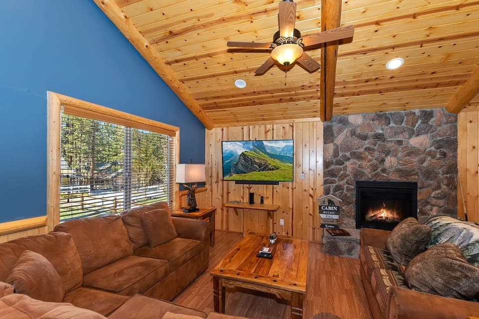 With touches of light wood and contemporary decor, this isn’t your ordinary cabin. Circle around the fire in the living room on cold days, or grill up some food on the patio on the warm ones. A game room complete with darts, foosball, and a wet bar provides a perfect place to relax, but if you’re not competitive, you might prefer the outdoor hot tub. Comfortable and chic, this is the outdoors in style.