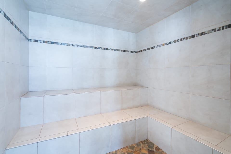 The master bedroom is up another half-flight of stairs, with a queen bed and a flatscreen TV. This bedroom also has an en-suite bath with a walk-in shower and large vanity area. The second bedroom with a queen bed is another half-flight of stairs up and also has its own flatscreen TV. On that landing is the second bathroom with a fully tiled walk-in shower. Up a small flight of stairs is the loft, which has two twin beds.