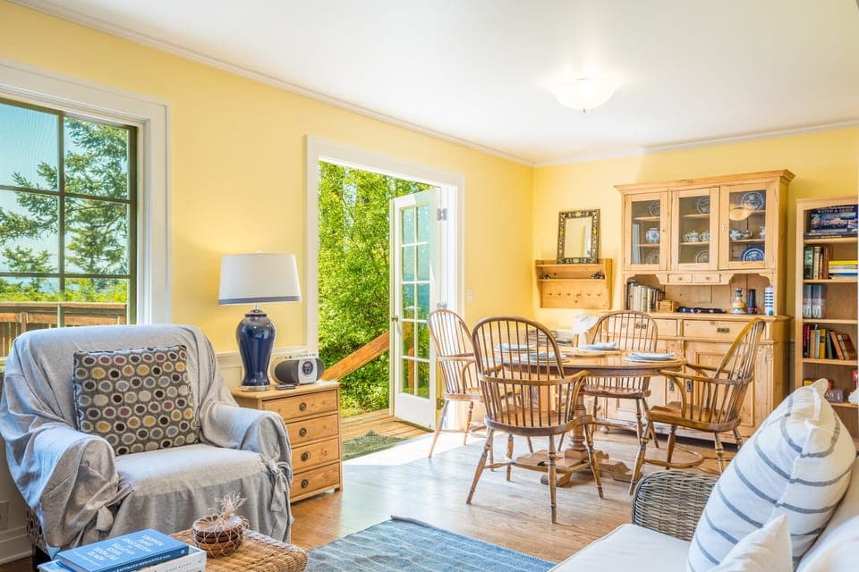 Perched on the west-facing bank between Freeland and Greenbank, this cozy cottage occupies one of the most extraordinary locations on Whidbey Island. Offering sweeping 180-degree views of the Sound and Olympics, there's also a private stairway (rebuilt in 2020) leading to over 4 miles of sandy walking beach. This cottage is a dream retreat for couples, families, and artists seeking inspiration and tranquility.