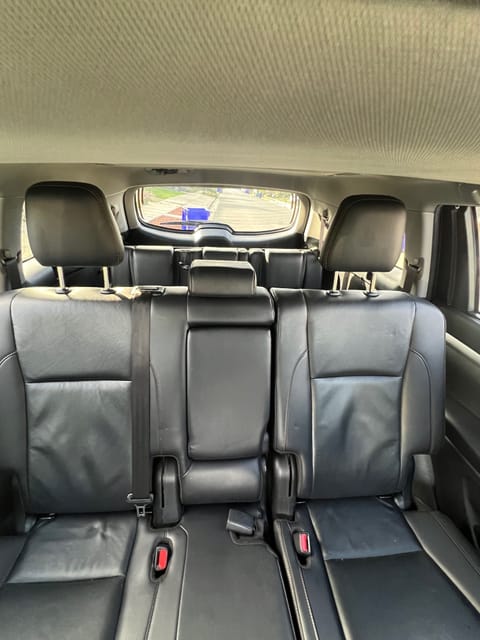 Room for 8 people, regular front seats and then two rows of bench seats in the back which fit 3 in each row. The back row is less roomy, more ideal for kids and pets. The bench seats fold completely flat, creating the size of a double bed in the back. I have a blow-up air mattress that fits perfectly back there, with two pillows and bedding available. I have some basic utensils plates and cooking gear available as well. Car camping made easy!!