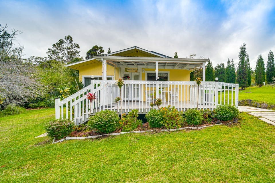 Named ‘Halakea Hale (Pineapple House),' this peaceful 2-bedroom, 1-bath cottage combines traditional charm with modern comforts. Sip coffee on the deck as you marvel at the natural beauty of one of the few remaining ancient rainforests in the Volcano area. Discover natural attractions nearby, such as the Steam Vents and stunning views at the Kilauea Overlook. Explore further with a beach day at Punaluu Black Sand Beach.