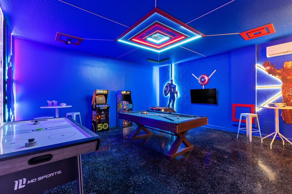 3. It’s a full-on play palace. Not only does this home have a backyard pool & spa (gated and covered for safe splashing around), it also has a Marvel-themed arcade in the converted garage with a pool table, air hockey, foosball, and head-to-head gaming station.