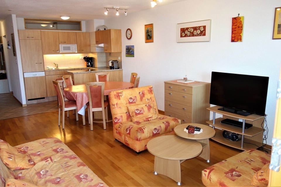 The spacious living-dining area features a comfortable sofa bed (140 x 200), cable TV, and DVD player, complemented by a fully equipped kitchen with a ceramic hob, oven, fridge, microwave, dishwasher, and coffee machine for easy meal preparation. Accommodations include a bedroom with 2 single beds (90 x 200) and a cozy room with bunk beds (90 x 200), along with a bathroom featuring a bathtub, washbasin, and WC.