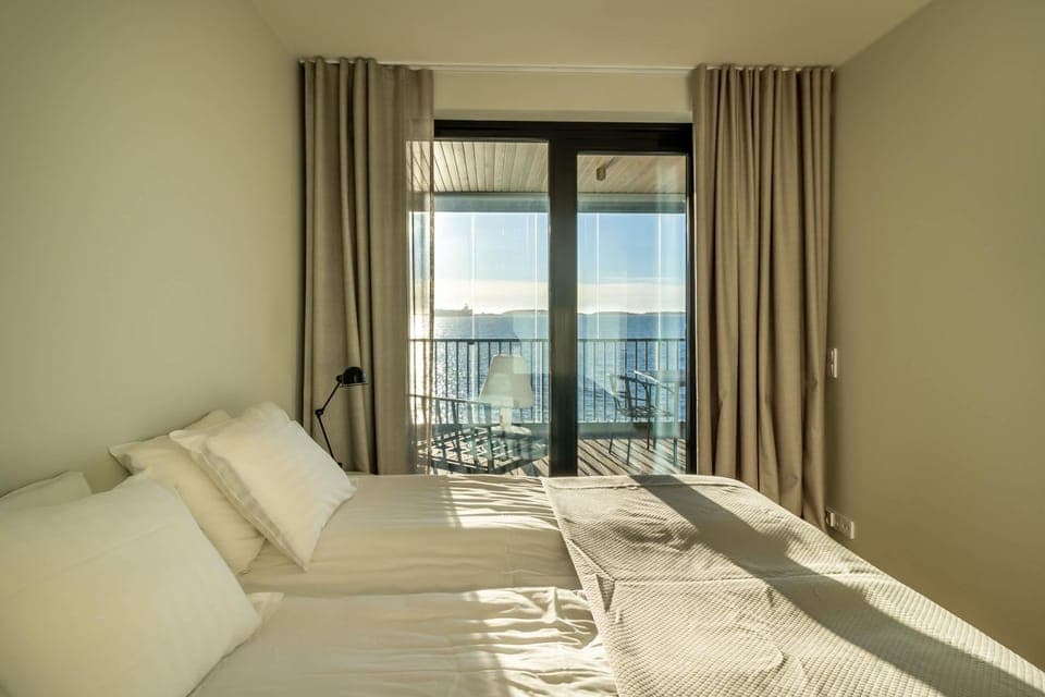 Upea näkymä merelle ja oli ihan kiva seurata sivuikkunasta satamassa laivojen lastausta. Laadulla ja tyylillä sisustettu asunto uudessa talossa.