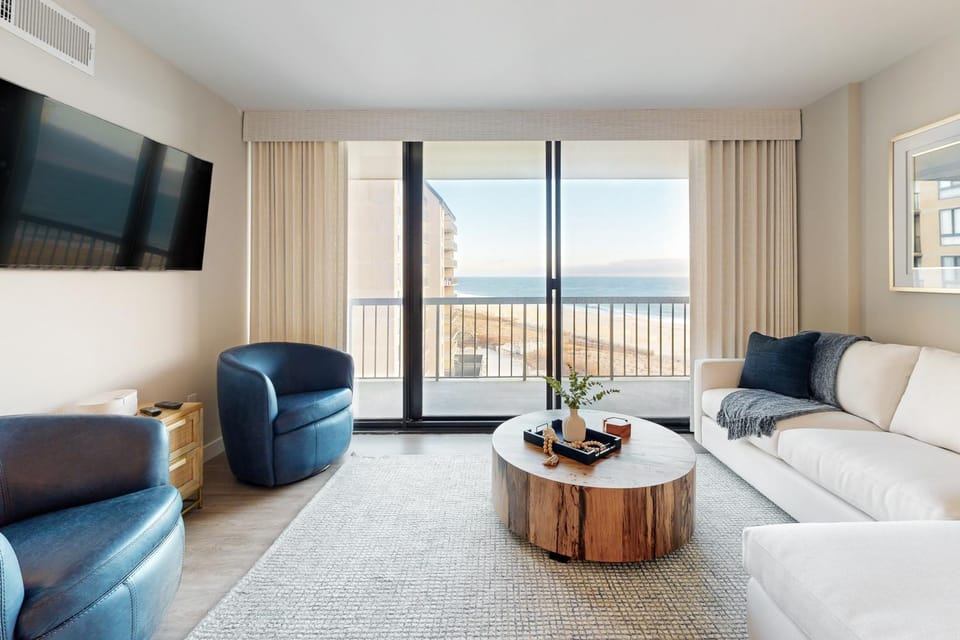 Business stays, family stays, couples stay, getaway vacation, and rental in Sea Colony at Oceanfront Condo in Gated Community cleaning and beach chairs included for $459 for your next trip.