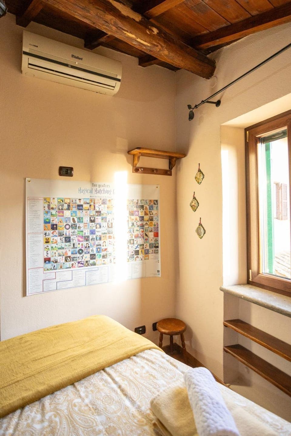 It a real Treasure Trove in the old part of Frascati - down a bit near the Duke of York (no, not him) Piazza who visited in the 18th Century. For a moment you could be Bilbo Baggins from Lord of the Rings - it’s small but quaint - up a stairs either a sideways (just about) view of Rome and then into the living room and kitchen. Up more rickety stairs to the bedroom (double and single) and another ladder to…somewhere. Kitchenette has every gadget u set the sun. Heating and aircon.