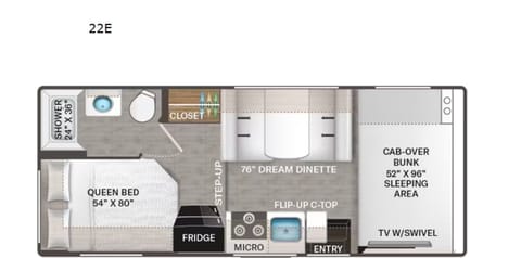 If you wish to escape the hustle and bustle of everyday life with your favorite people then check out this motorhome! Everyone will have a comfortable place to sleep between the rear corner 54x80 inch queen bed, the 52x96 inch bunk over cab with a 40 inch TV on a swivel for entertainment at night, and even the 76 inch Dream Dinette can transform into an extra sleeping space. Store all of your essentials in the closet just outside the rear corner bathroom which has a 24 x 36 inch shower and keep your perishables fresh in the refrigerator. The flip-up countertop extension makes it easier to prepare your home cooked meals.