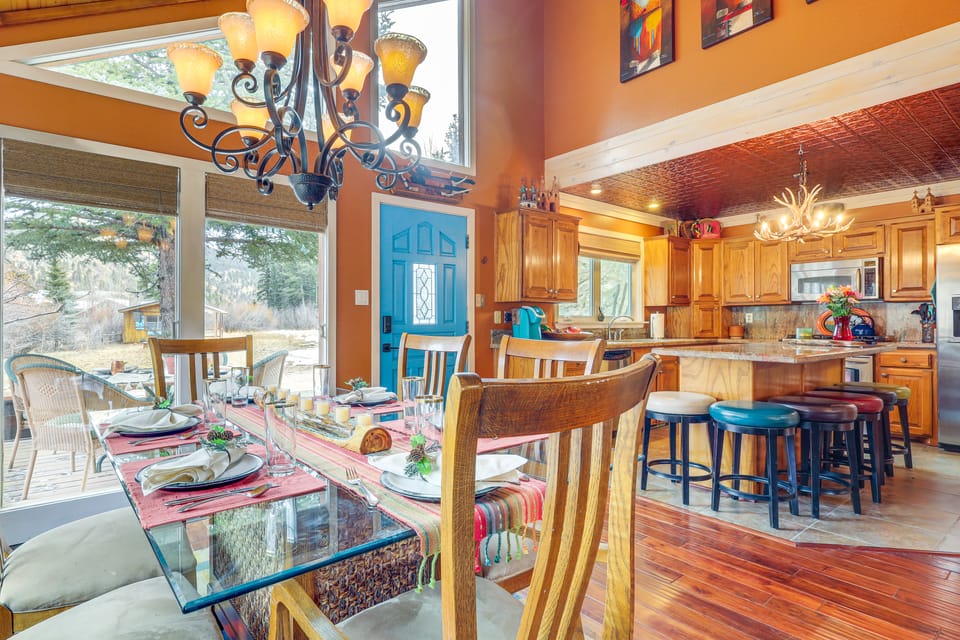 Your next Red River getaway sits nestled between Pioneer Creek and the forested peaks of the Sangre De Cristo Mountains. This 4-bed + loft, 2.5-bath home has plenty of space for the whole crew, from the colorful cabin-esque interior filled with Southwestern flair to the oversized private yard running up to Carson National Forest. You’ll find tons of all-season fun around this vacation rental.