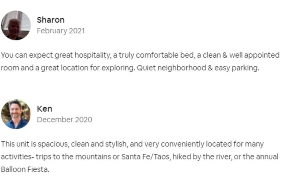 The location is close to everything in Albuquerque, which made site seeing and dining easy. The bed was super comfy and the towels were really fluffy. I wanted the option of a kitchen and although I didn't use it much, it had everything I needed. The AC was also really nice to have and kept the apartment cool. The privacy fence was a great feature and added a quiet porch area as well as keeping headlights from shining through the door window. If we come for the Celtic festival next year I will try to get this place again!