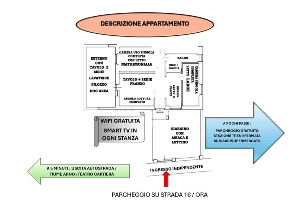 Ampio appartamento, dotato di ogni comfort. Due camere da letto e un bagno spazioso. Presenza di kit necessario per il bagno. Posizione a 10 minuti dal centro e vicinissimo al Arno. Proprietari accoglienti e professionali.