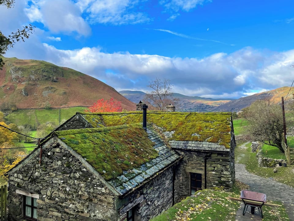 Bedroom: Double (4ft 6in) Bed, Single (3ft) Bed. Electric central heating, electricity, bed linen and towels included. Doggy extras. Enclosed back garden with patio, sitting out area and garden furniture. (shared with other properties on-site). Private parking for 1 car. No smoking. Please note: No children under 12 years old. There is a step in the garden, and sloping banks and steep drops within the grounds. This property has a natural water supply via spring.. The Fold is a charming romantic retreat with its entrance, offering stunning valley views and a cosy, character-filled interior. You enter through the kitchen/diner, equipped with an electric cooker, fridge, and ample kitchenware. The ground floor also features a spacious shower room with a washing machine. The living room has a log-burning stove, comfortable seating, and unique floor-level windows—once doorways for farm animals. A raised area with a sofa can be curtained off for extra privacy. Upstairs, the loft bedroom has a double and single bed. Outside, enjoy a private terrace, an apple orchard, and access to Martindale Beck. Walk through the fields to the open fields for breathtaking Lake District scenery.