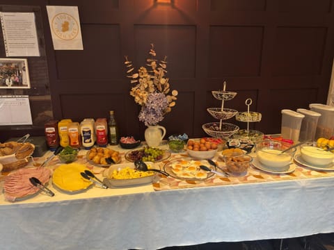 Breakfast was served from 8 to 10 a.m. We arrived at 9:20, and while all the food was already displayed, everything was cold. It looked good but included cold fried eggs, boiled eggs, porridge, and sausages. There was only one type of hard sliced cheese and one type of sliced ham, with no vegetables or salads at all. The bread selection was limited to white and brown toast. The only hot items were tea and coffee. On the positive side, there were nice croissants and muffins to choose from.