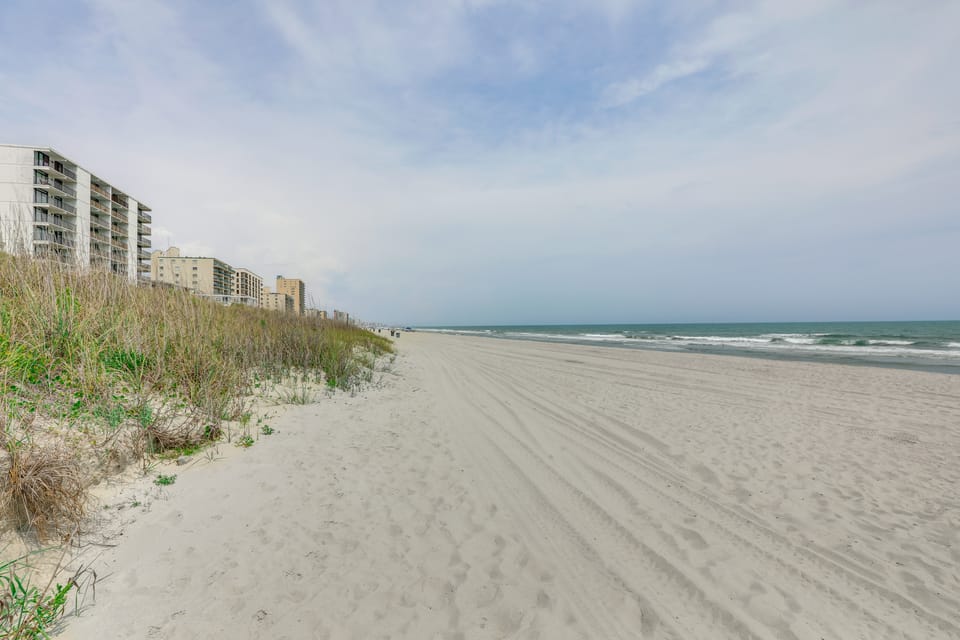 Take your beach getaway to the next level at this vacation rental in North Myrtle Beach! This 2-bedroom, 2-bath condo lies just steps from the beach and features a balcony for sipping morning coffee and enjoying the ocean breeze, a fully equipped kitchen, and a cozy living space with a Smart TV. When you're not relaxing poolside, consider perusing Broadway at the Beach or enjoying a round of golf!