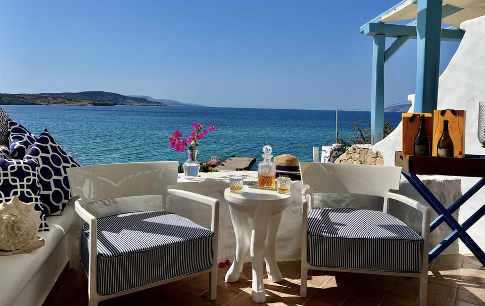 Idyllic, perfectly positioned Aegean island beach house in an elevated, sunset facing position, 10 metres directly above the beach. This perfect house on the west side of Koufonisi village with spectacular views has very easy and short walking access to all beaches, restaurants, bars, shops, gym, main harbour, night life and wonderful swimming directly in front of the house.