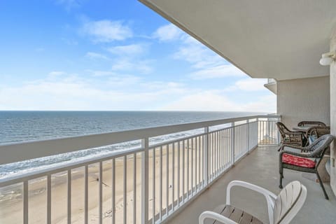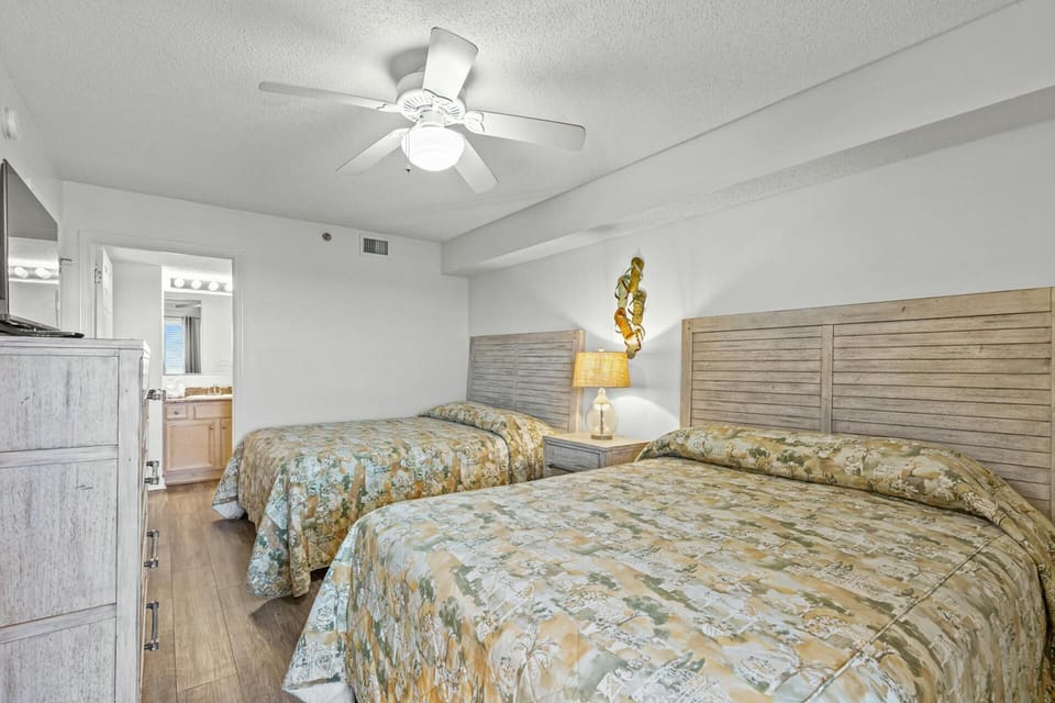 This cheerful oceanfront condo has three bedrooms, three bathrooms and can accommodate up to 12 guests. The bright yellow walls in the oceanfront living room look great with the blue accent pillows and neutral sleeper sofa and loveseat. Enter the balcony from the sliding glass door in both the living room and master suite. The yellow walls flow into the tiled dining room and fully equipped kitchen. The master bedroom has a king-sized bed, designer furnishings and an en suite bathroom. The two guest rooms each have two queen-sized beds. Crescent Shores offers an indoor pool, a large outdoor pool and lazy river, and two outdoor hot tubs, all just footsteps from the ocean. A fitness center is also on the premises. Located in the Crescent Beach section on historic Ocean Boulevard, Crescent Shores is within minutes from all the action on Main Street to the north, and renowned shopping and dining at Barefoot Landing to the south. The resort is also walking distance to an Irish pub that offers a unique oceanfront dining experience, as well as an ice cream shop to cure any beachgoer's sweet tooth. The beach at Crescent Shores offers the more adventurous guest seasonal parasailing and banana boat rides, something exclusive to the Crescent Beach area.
