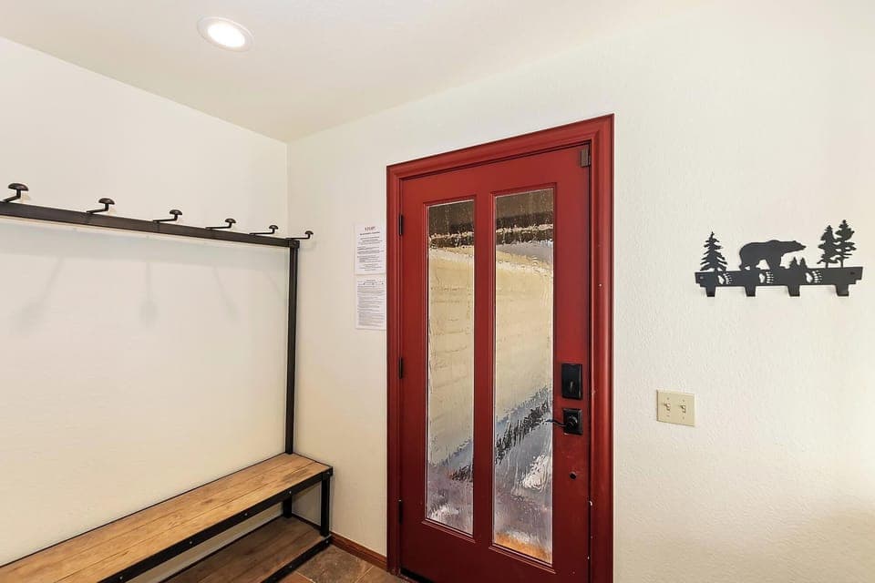 The lower level of the home features a spacious game room with a pool table, arcade game, and large sectional couch. A set of sliding glass doors leads to the outdoor hot tub, ideal for unwinding after a day of adventure. Enjoy the warm wood features and high ceilings that enhance the room’s inviting atmosphere.