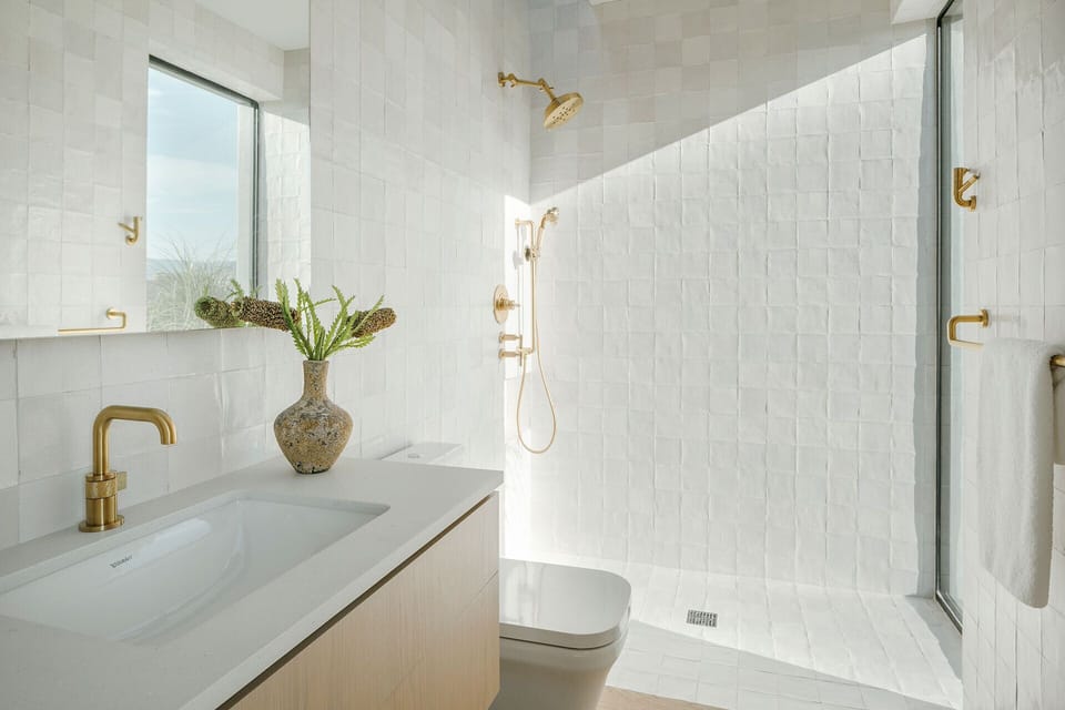Each of the bedrooms is a private suite and has a hotel quality mattress, en suite bathroom, flatscreen TV, ample closet space and private access to the outdoors. The Primary Suite has a King bed and a wall of glass that opens up fully to the yard. The en suite bathroom has a large shower and dual sinks. The deep tub has inspiring views to contemplate while you soak. Suite 2 has a King bed and en suite bath with shower. Suite 3 has 2 bunk beds with Doubles on the bottom and Twins on the top as well as an en suite bath with shower. Suite 4 is in the stunning detached Casita and has a King bed, sitting area and en suite bath with shower.