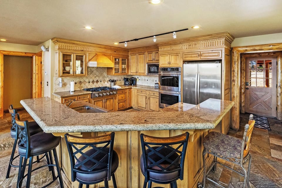 The wonderful open floor plan will allow your group to gather together while preparing a family style meal or hosting a group of friends for cocktails & hors devours. Enjoy a fully stocked kitchen that has everything you need including a double wall oven, 6 burner gas stovetop, dishwasher, microwave, toaster & coffee maker. A glass dining table located just off of the kitchen has seating for 8 while the kitchen island breakfast bar offers 3 barstools, a great place for a quick breakfast before you head out the door for a day on the mountain.