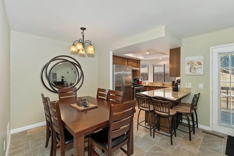 The main living area offers plenty of comfortable seating on a cozy sectional couch surrounding a gas burning fireplace and smart flat screen tv. Located just off of the living area is a mini bar with sink area perfect for hosting friends for craft cocktails! This living space welcomes you and your group to gather together and relax after a long day of mountain adventures.