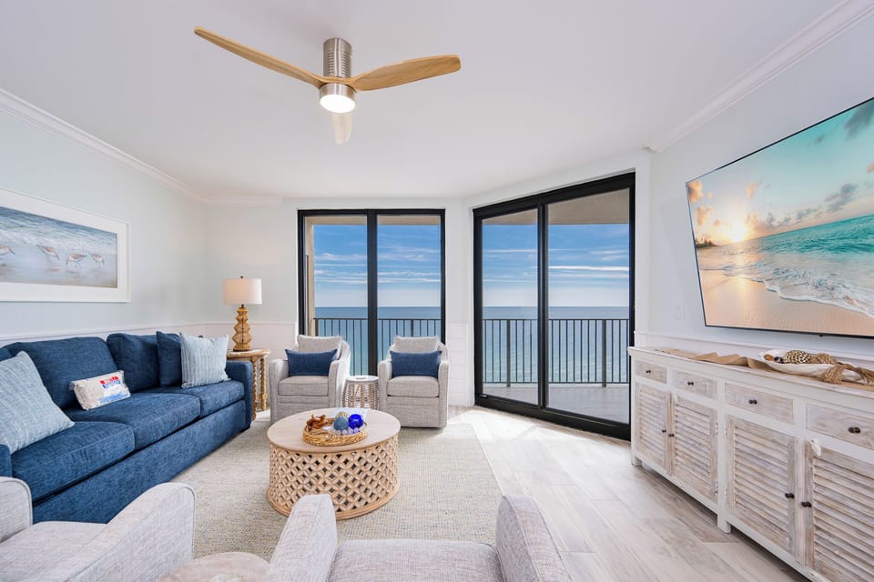 Interior: As you step inside, you'll be greeted by the timeless elegance of traditional design elements. Rich, warm tones and classic furnishings create a sense of sophistication throughout the space. Tile flooring in the main living area creates a seamless and stylish foundation for your coastal haven. Floor-to-ceiling windows bathe the space in natural light while providing breathtaking Gulf front views.