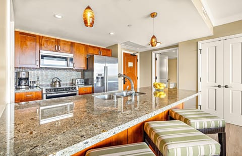 Together, the neighboring suites offer over 3500 sq ft of interior living space and can accommodate up to 18 guests with a king-size bed in each bedroom and a queen-size convertible sofa sleeper in every living area. For added flexibility, one of the king-size beds in Hokulani 815 can be split into two XL twin-size beds for no charge.