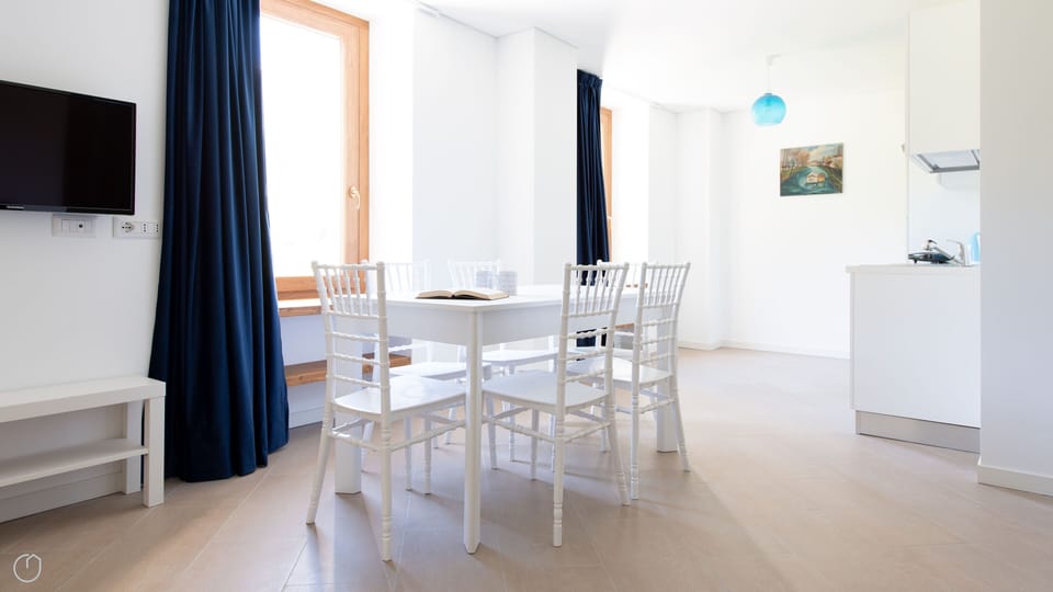 The kitchenette is equipped with all the necessary equipment for a comfortable holiday, such as a kettle, toaster, juicer, induction hob and traditional oven. Villa Tola Bormio, the house in which the Blue apartment is located, has: