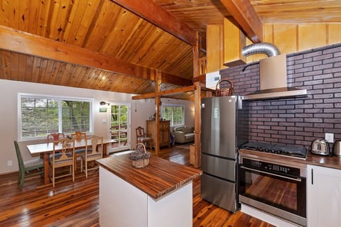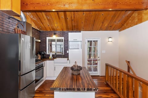 Head upstairs to the open-concept main living area, where modern amenities blend seamlessly with rustic cabin vibes. The beautifully updated kitchen boasts a small island, a gas stovetop/oven, a FlexBrew coffee maker, and a microwave. Enjoy family meals around the picnic-style dining table with bench seating. The living room features a cozy fireplace, making it the perfect space for gathering with loved ones.