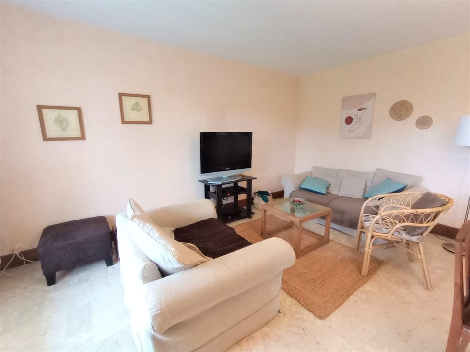 A comfortable living room with a dining table and TV