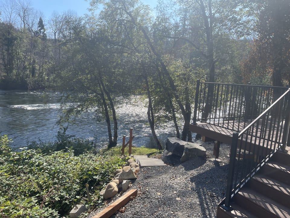 Enjoy the views from the newly built deck, or go down to the grassy lawn to relax, have a fire, and access the river directly. The deck is 400 sq ft with an expandable table and 6 chairs. Perfect for eating, working, happy hour, and that morning cuppa Joe. Go down to the soft, private, grassy river bed with a blanket for a nap or to read a book. Wave to the boaters, rafters, kayakers, and ducks as they roll by on the water. You can also cast your own line and launch your own kayak right from the yard.