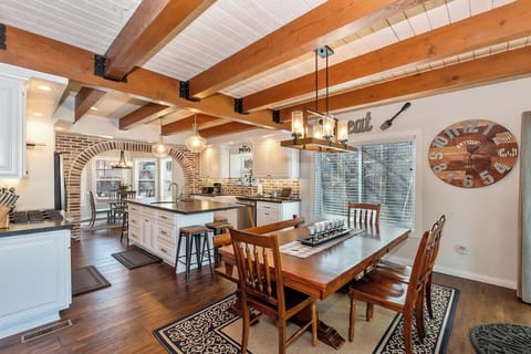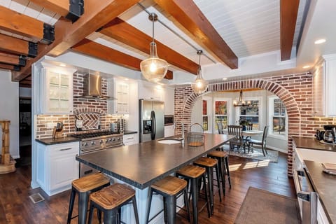Gourmet Kitchen: Upgraded countertops, custom cabinetry, and stainless steel appliances, including a Viking gas range/oven. The kitchen also features a breakfast nook and plenty of space for meal preparation. A standard coffee maker is provided, while open beam ceilings and industrial lighting create a magazine-worthy space.