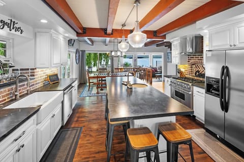 Floor-to-ceiling picture windows offer unobstructed lake views. Enjoy a Foosball table, wood-burning fireplace, and flat-screen TV in the spacious family room with comfortable seating.